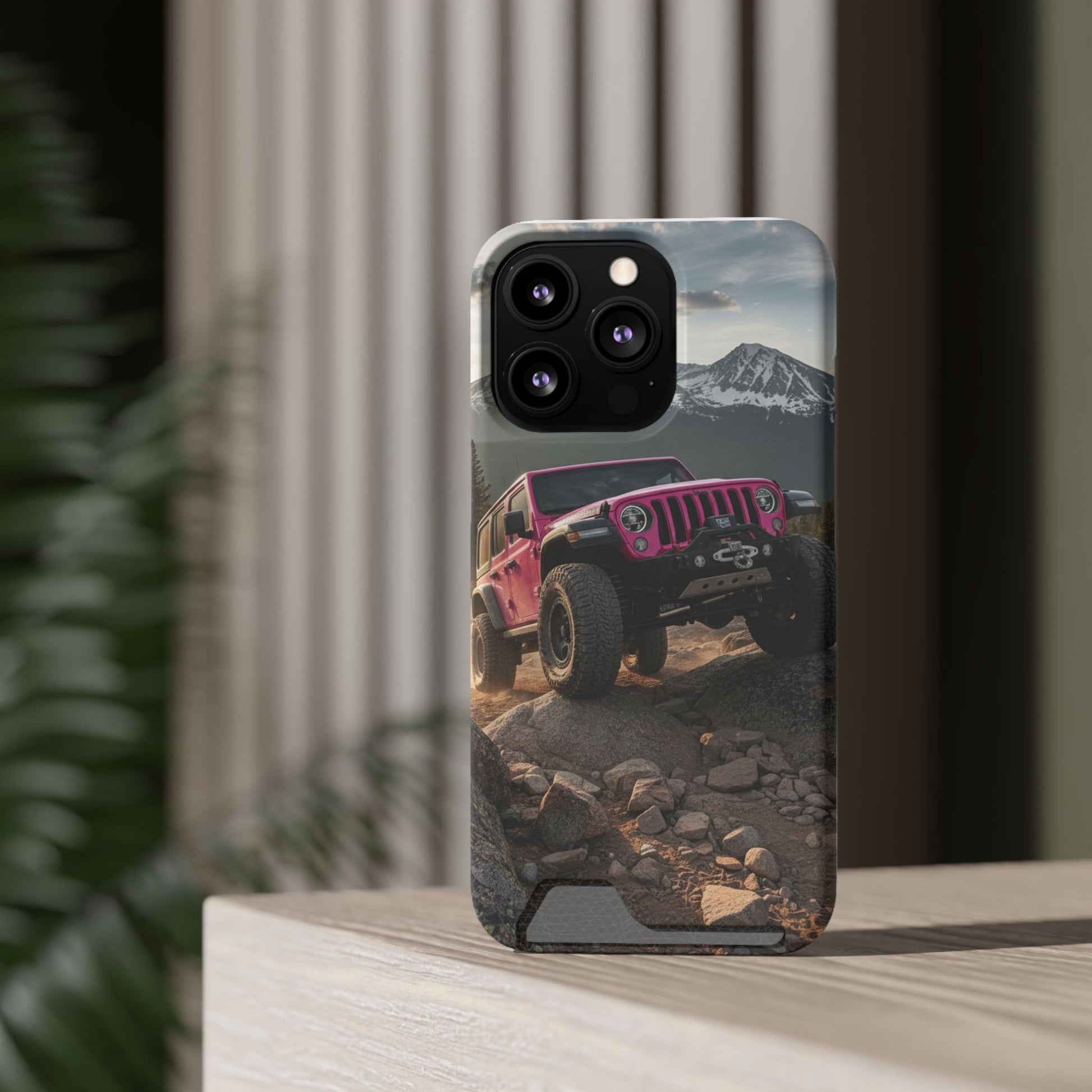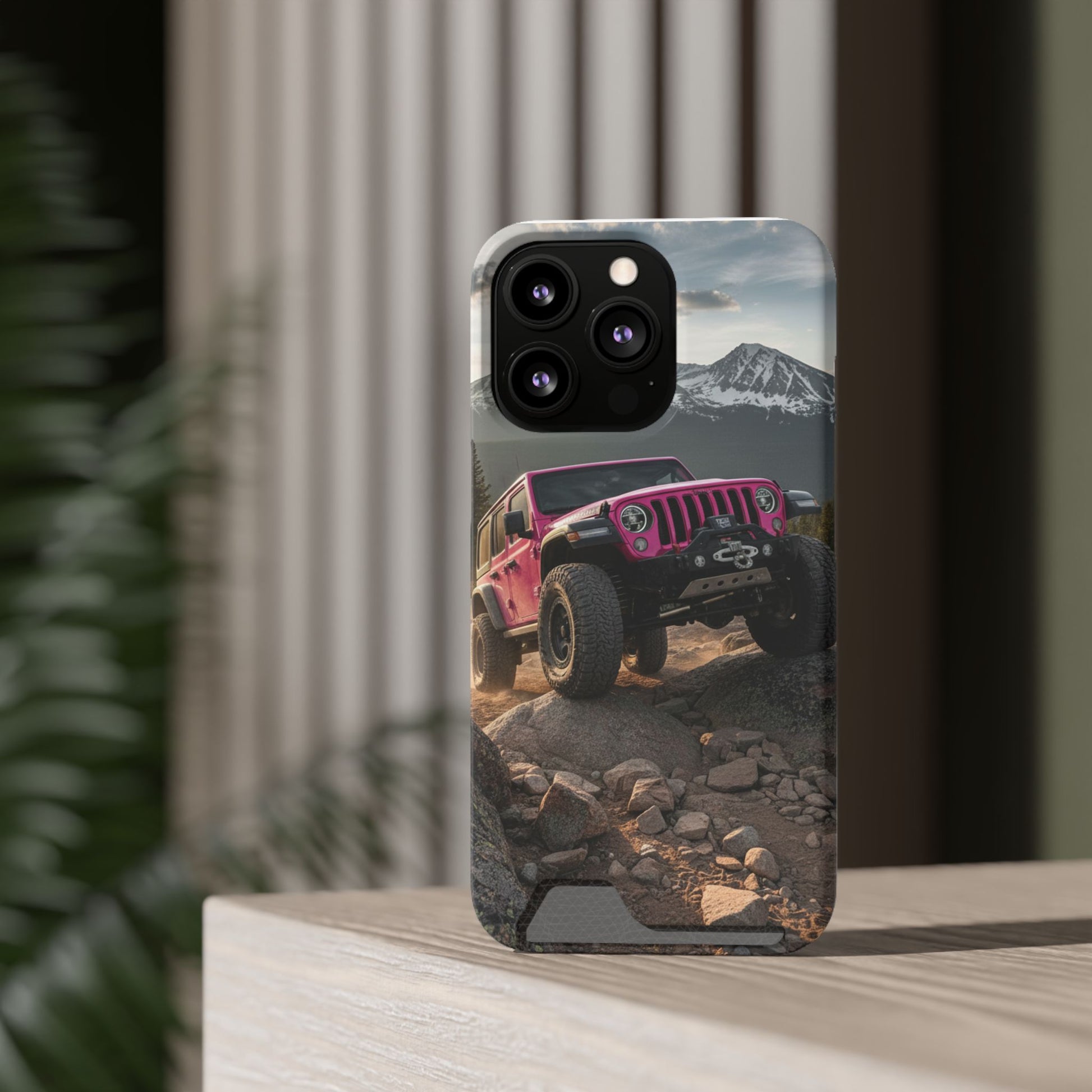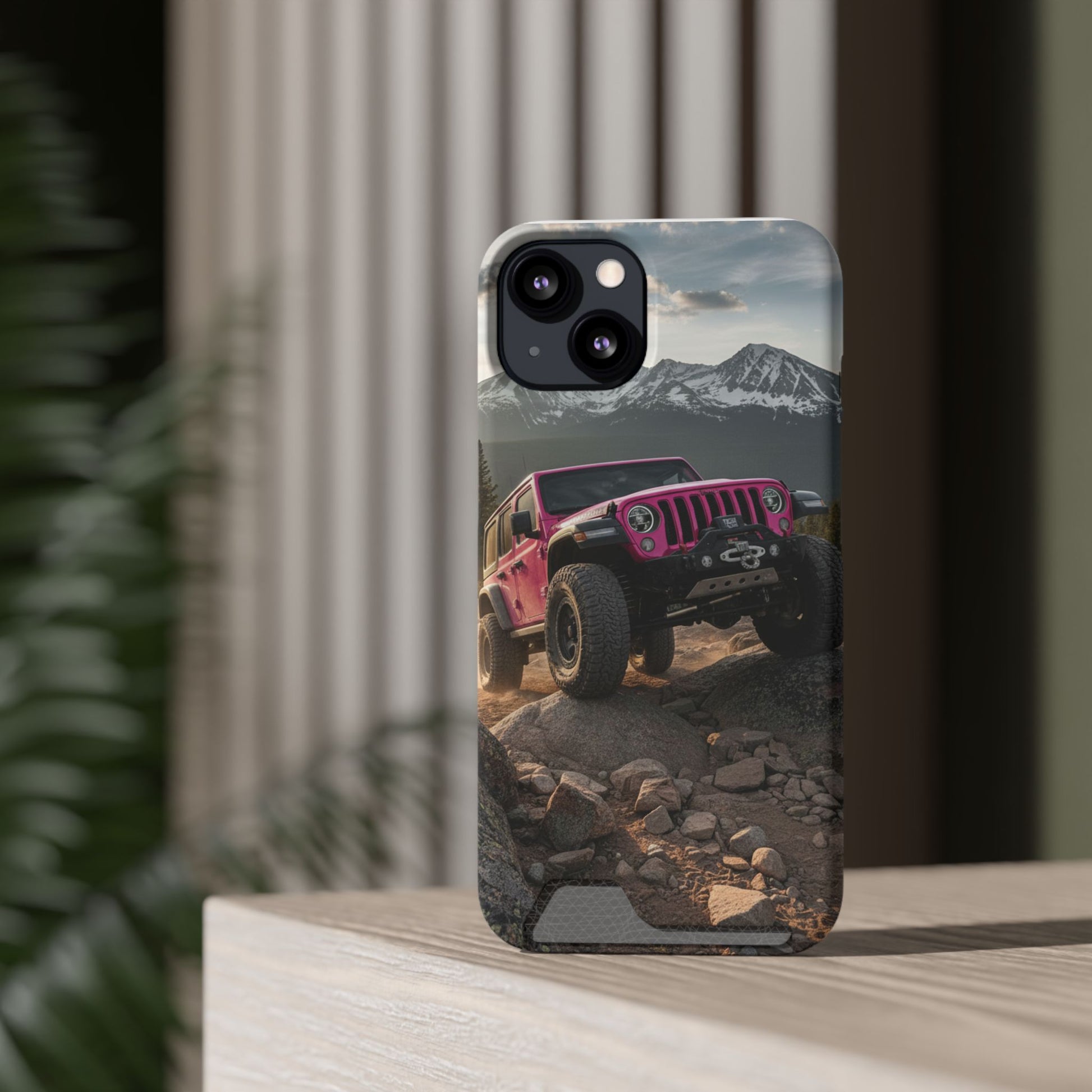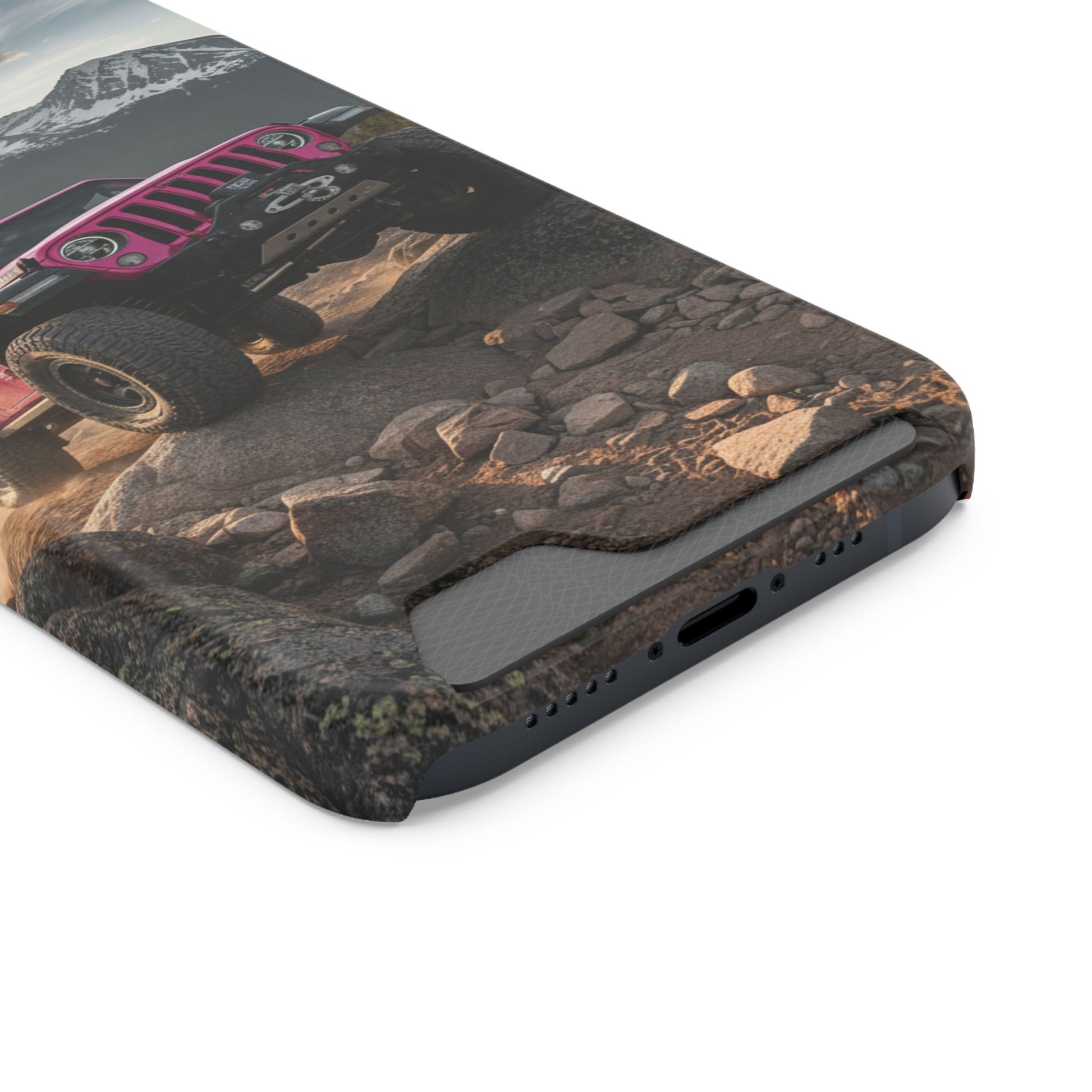 This slim, durable phone case brings the thrill of off-road adventure to your pocket. A vibrant, full-wrap print shows a pink Jeep tackling rocky terrain beneath snow-capped peaks — a bold image that stays bright thanks to high-density 3D ink transfer. The polycarbonate shell absorbs impacts while keeping ports open and MagSafe accessories compatible. A discreet card slot on the back holds one essential card for quick trips. Choose glossy or matte finish and add gift packaging if you’re sending it to someone who lives for the trailhead and wide-open views.